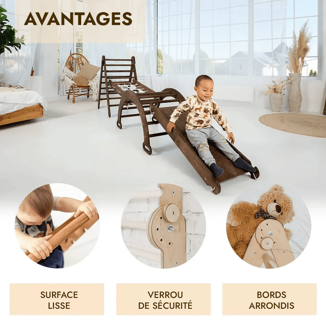 Set de Triangulaire 4 en 1: L'échelle triangulaire + Arche+ Toboggan + Filet à grimper - Chocolat