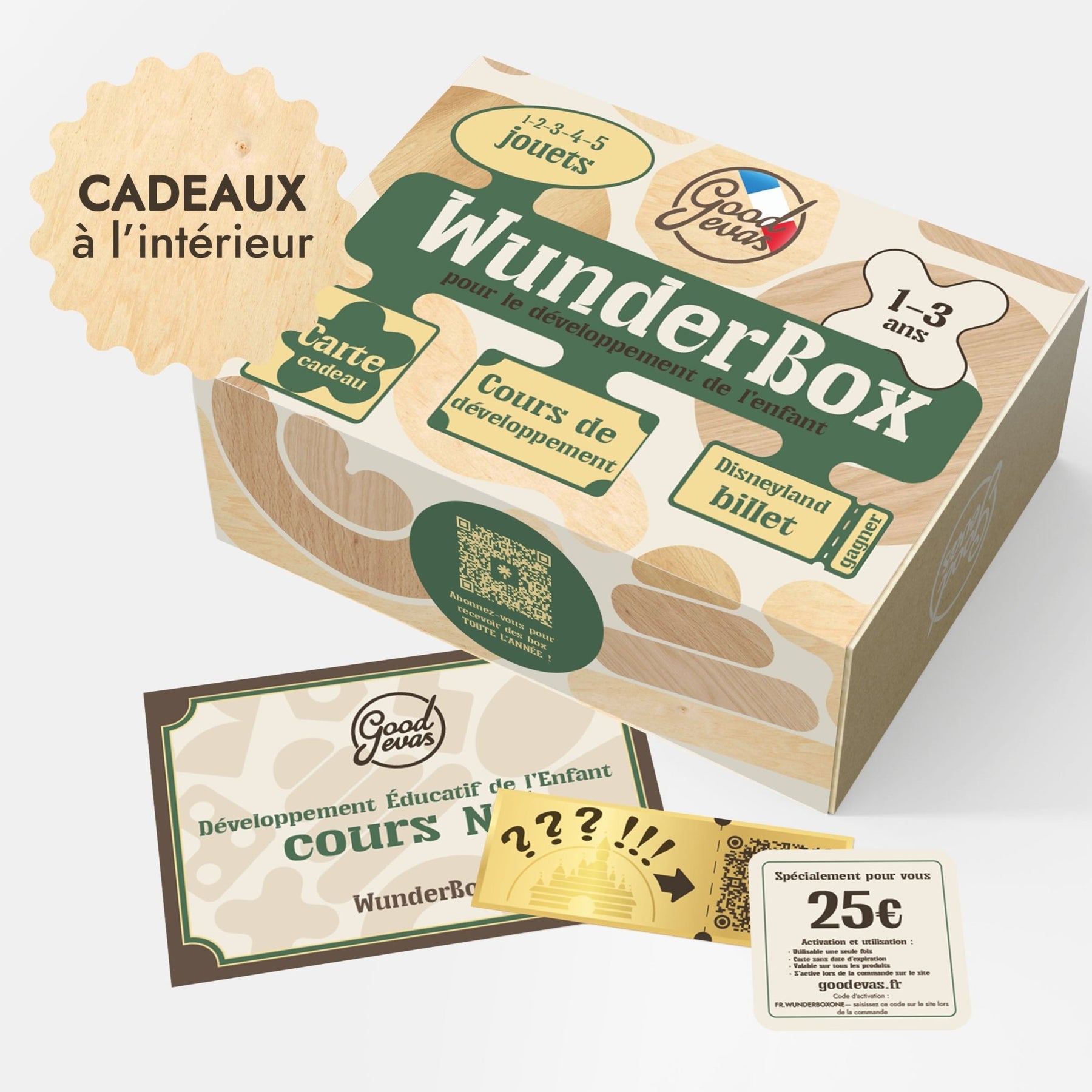 Chaque boîte contient des jouets soigneusement sélectionnés pour stimuler les compétences clés à chaque étape de la croissance, un cours vidéo exclusif basé sur la méthode Montessori pour les parents, une carte de réduction valable sur toute la gamme Goodevas, ainsi qu'une participation automatique au tirage au sort pour gagner un voyage à Disneyland.